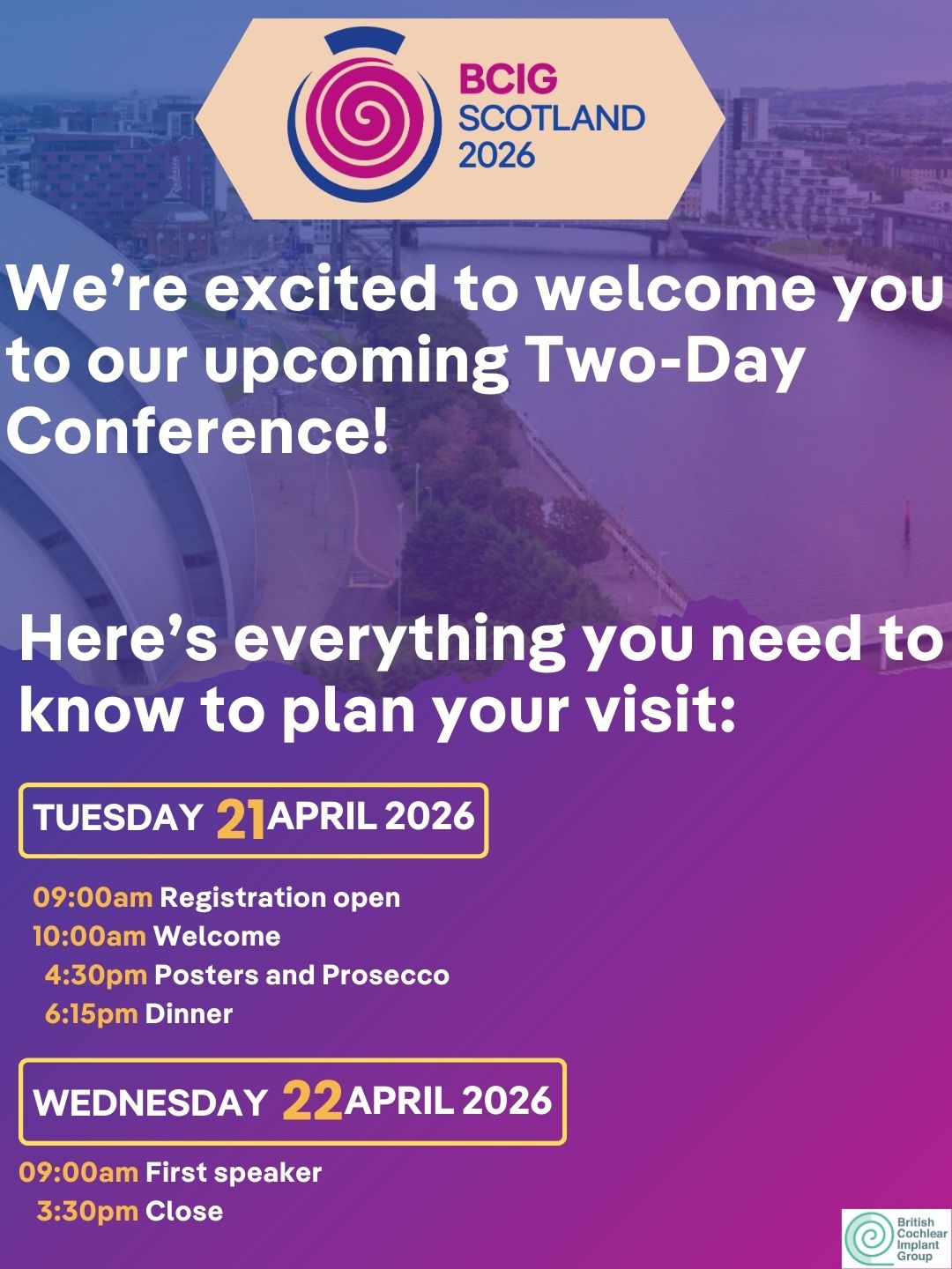 Patients Welcome to the patients' area. Learn more about cochlear implants in this dedicated area for Patients. Professionals Are you a Professional? Please explore this area for helpful resources and information for your profession. Abstract submission now closed. Registration open now! Welcome to the British Cochlear Implant Group BCIG is a unique group of health care professionals and other interested parties in cochlear implant provision in the UK. The BCIG believes that if a patient meets the criteria for a cochlear implant as specified in the NICE Guidance, funding for that treatment must be provided by the appropriate healthcare commissioning body following a positive assessment by the specialist cochlear implant centre. Explore About Us BCIG Webinar Series 2026 To return in March! The popular BCIG Webinar Series continues this year and the next presentation will be in March.. The presentation will run for approximately 30 minutes, with 15 minutes for questions. A library of recordings of previous webinars is available to BCIG members in the Members' Area. The NRHI is now LIVE for all CI Centres in England!! 9th June: Newsflash- the NRHI is now LIVE for all CI Centres in England!! A huge thank you to all teams for entering your data, to improve safety and effectiveness for the patients in our care. Members are reminded that additional resources are available in the Members' Area. Please ensure the fact number is in the top area and any text is in the bottom. Number characters (£, %, k) can only be at the start or the end of the number. 24806 people in the UK use cochlear implants 1537 New UK cochlear implant recipients 2024/2025 Cochlear implants improve quality of life What are cochlear implants? A cochlear implant is an electronic device which may be suitable for children and adults who receive little benefit from conventional hearing aids. Conventional hearing aids work by making sounds louder. A cochlear implant is different because sounds are turned into tiny electrical pulses, which are sent directly to the nerve of hearing. The implant can therefore bypass some of the inner ear structures which are not working. Naturally it is important to remember that no electronic device can be expected to restore function to the levels experienced by a normally hearing ear. Learn More About Cochlear Implants Cochlear Implant FAQ's Member's Area Get in Touch Become a Member of the British Cochlear Implant Group BCIG is a unique group of health care professionals and other interested parties in cochlear implant provision in the UK. The BCIG believes that if a patient meets the criteria for a cochlear implant as specified in the NICE Guidance. Become a Member Today Latest BCIG News Follow us on LinkedIn BCIG 2026 Deniz Başkent will be at BCIG 2026 on Wednesday 22nd April: Challenges and perceptions of voice... Continue Reading BCIG 2026 The BCIG 2026 Conference Dinner will be held at the amazing Glasgow Science Centre on Tuesday 21st... Continue Reading BCIG 2026 Timings have been announced to allow you to plan your journey to BCIG 2026 in Glasgow. On-site... Continue Reading Hearpeers Webinar The latest in the series of free webinars from MED-EL has been... Continue Reading Read All News View All Events