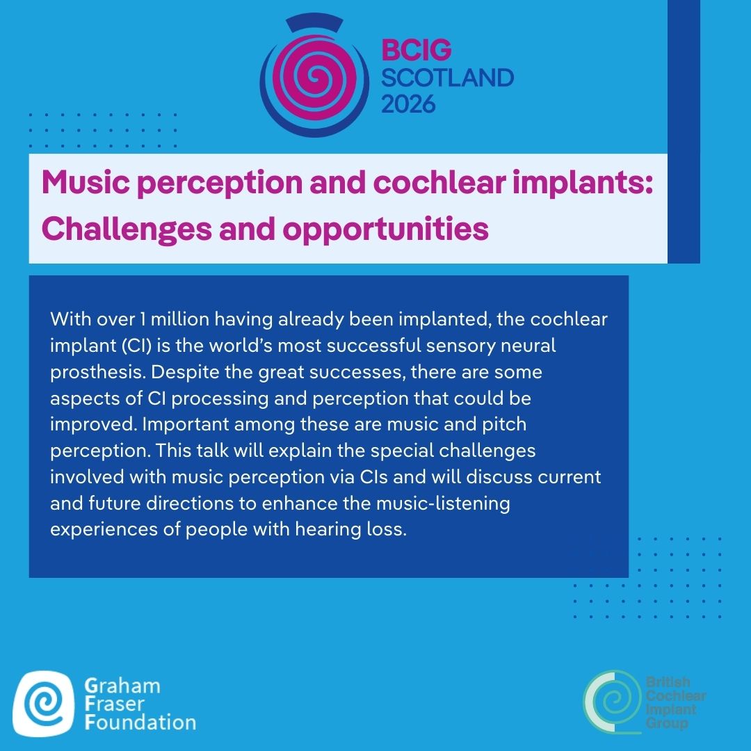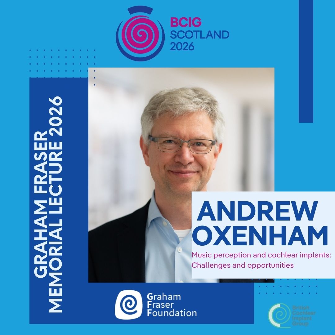 BCIG are pleased to announce that this years Graham Fraser Memorial Lecture will take place on Tuesday 21st April at BCIG Glasgow with Andrew Oxenham. The title is Music perception and cochlear implants: challenges and opportunities.